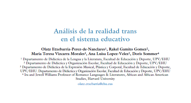 Keys to Incorporating Trans Identities into the Education System: A Case StudyEtxebarria Perez de Nanclares, O. (2024). Trans identitateak hezkuntza sisteman txertatzeko gakoak: Kasu azterketa bat [Tesis doctoral, Universidad del País Vasco / Euskal Herriko Unibertsitatea]. |